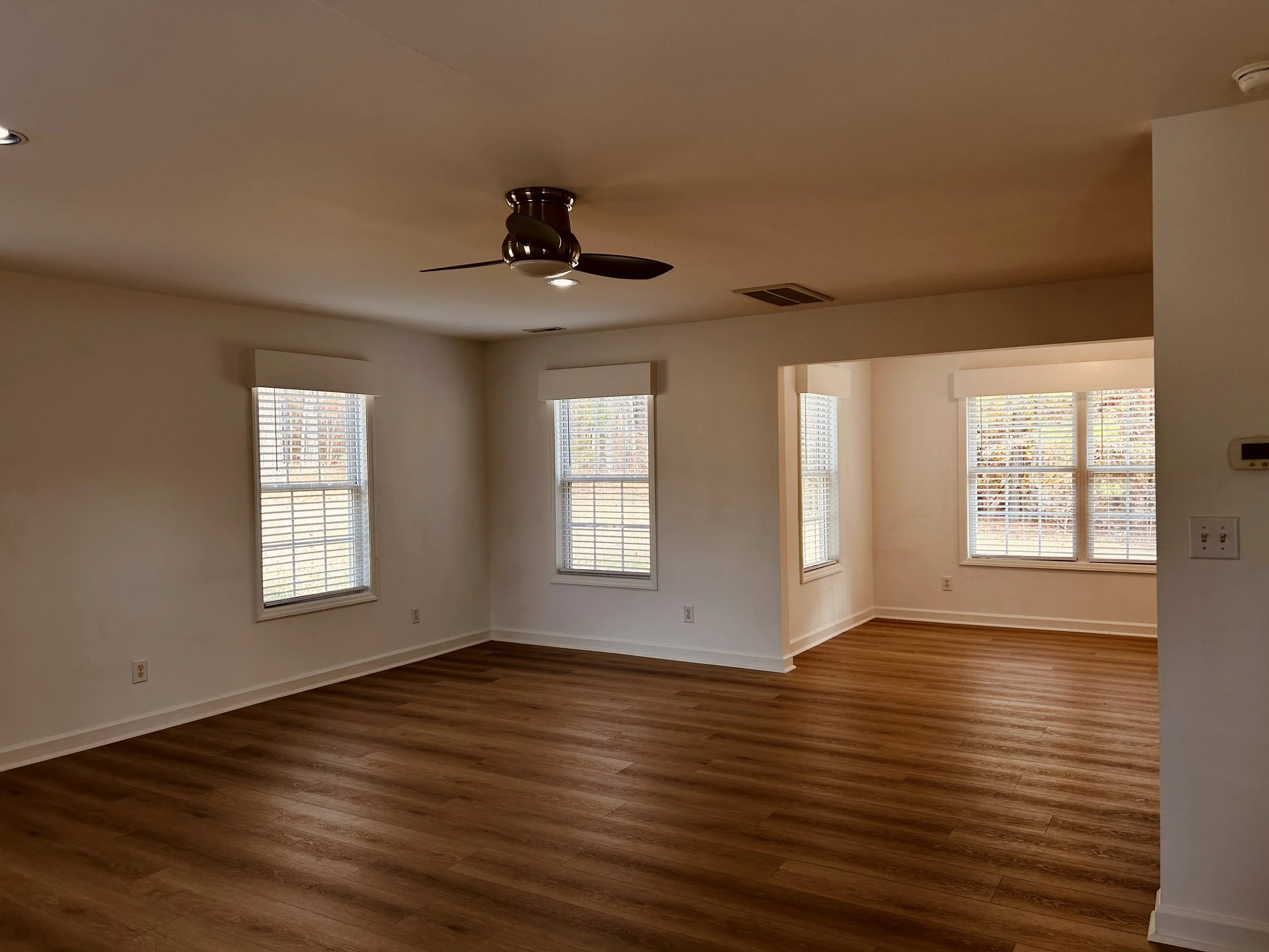 The first floor has an open layout. The front door opens to the large living area. The open layout continues to the dining nook at the back, the kitchen, laundry room and half bath to the right. The two car attached garage is accessed via the kitchen. New wood laminate flooring, granite countertops, ceiling fan and all appliances, including a washer and dryer.